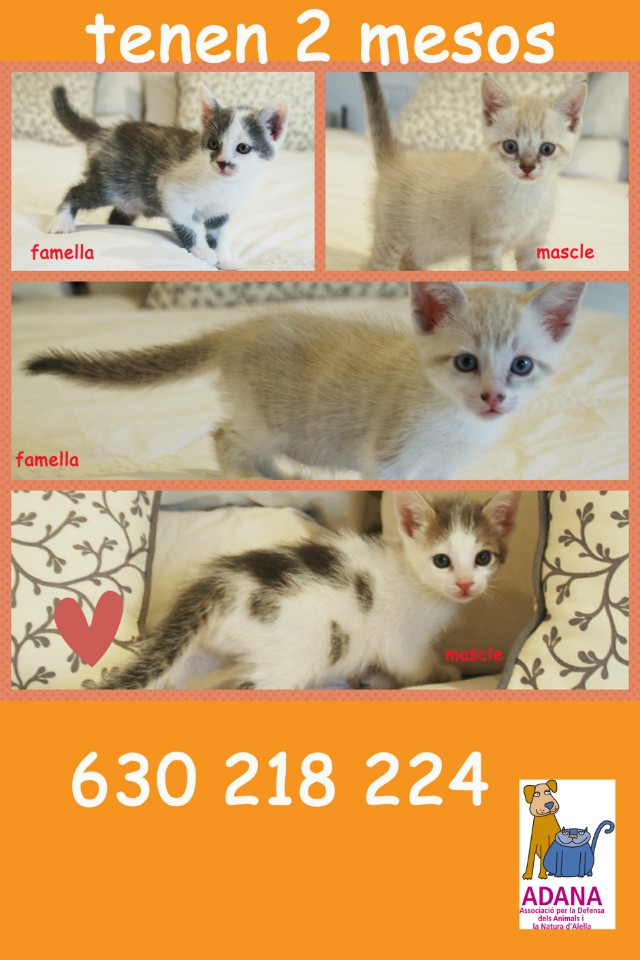 Es tracta de cadells de gat d’uns 2 mesos d’edat que necessiten una família que els adopti. Estan acostumats a tractar amb persones de totes les mides i edats, i a viure a dins de casa.